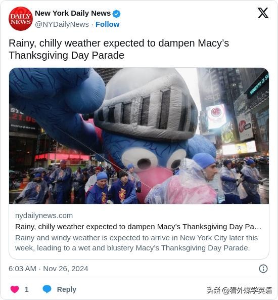 原文:Rainy, chilly weather expected to dampen Macy’s Thanksgiving Day Parade