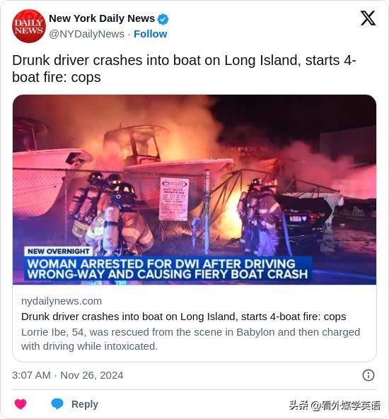原文:Drunk driver crashes into boat on Long Island, starts 4-boat fire: cops