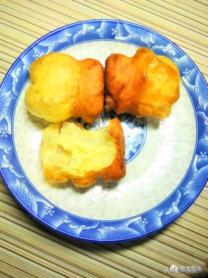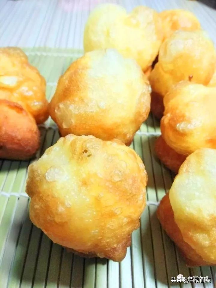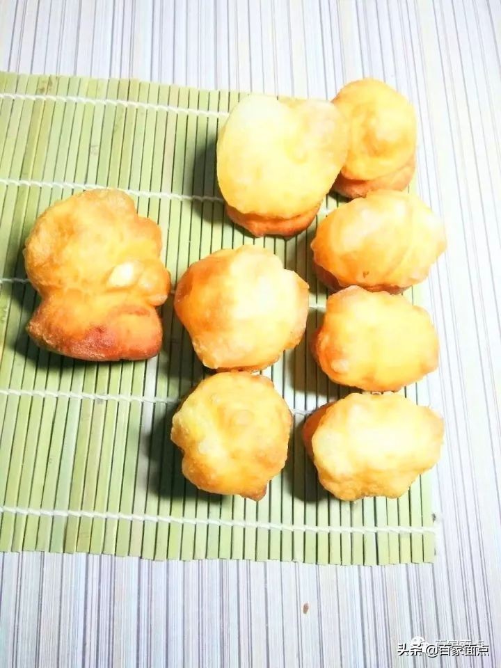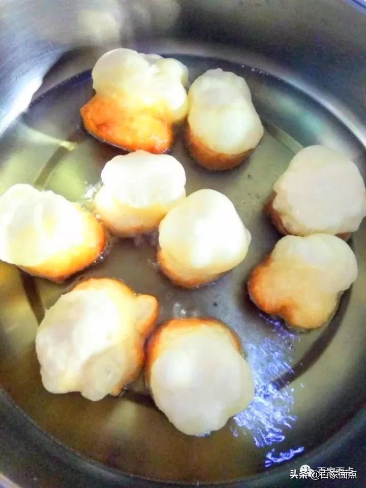 锅中放油烧热,用两根筷子把面缠个球状下入锅中,炸到膨胀两倍大下,再侧翻,炸熟即可出锅。金黄的面泡子,口感甚好。