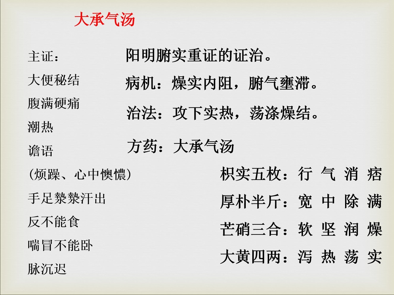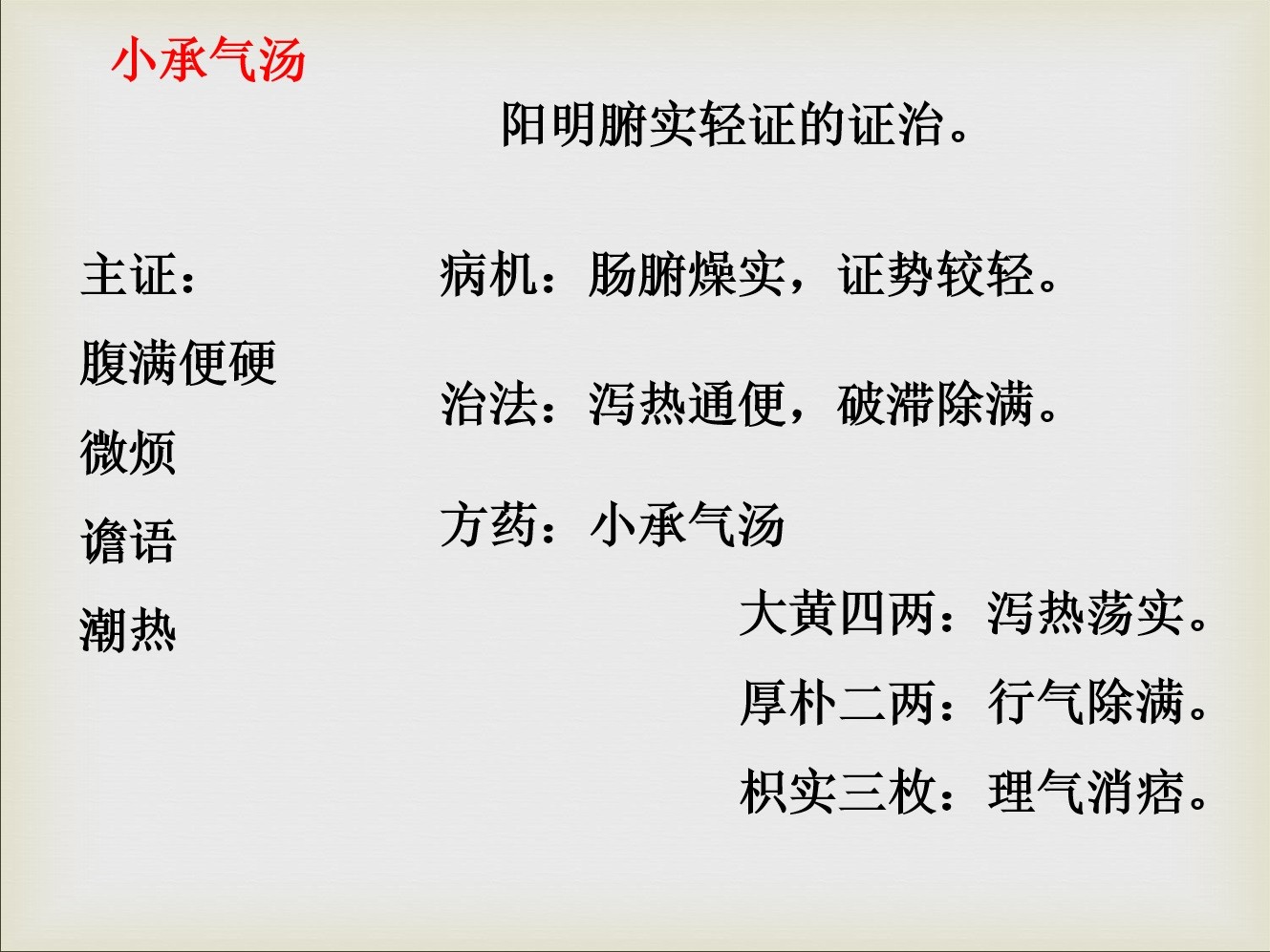 小承气汤来源于东汉张仲景的《伤寒论》213条,主治阳明腑实轻症而偏于痞满者,具有攻下通腑、轻下热结之良效。方中大黄荡涤肠胃,推陈致新;枳实破气消痞;厚朴下气除满。三者合用具有泻热通便、除满消滞的作用。