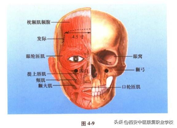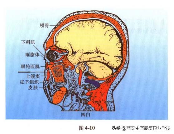 【穴位解剖】 皮肤→皮下组织→眼轮匝肌→提下唇肌→眶下孔或上颌骨。皮肤由上颌神经的眶下神经分布。针由皮肤、皮下组织经眼轮匝肌和提上唇肌,深进眶下孔、眶下管,可能刺人孔、管内的眶下神经、动脉和静脉。针沿管下壁,可至近眶下壁后部结构。所经表情肌由面神经的颧支和颊支支配(图4-9)。