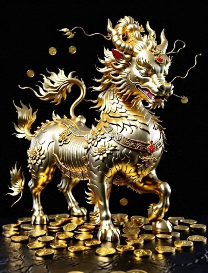 麒麟是中国古代神话中的瑞兽,象征吉祥、太平和长寿。它的形态特征综合了多种动物的特点,有着羊头(一说是麋身),狼的蹄子,牛尾,马蹄,鱼鳞皮,以及一只角,角端有肉,体色可能是彩色或黄色。