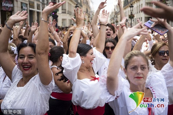 当地时间2019年7月7日,西班牙马拉加,一所弗拉门戈学校组织成千上万的人们齐跳弗拉明戈,旨在获得吉尼斯世界纪录。