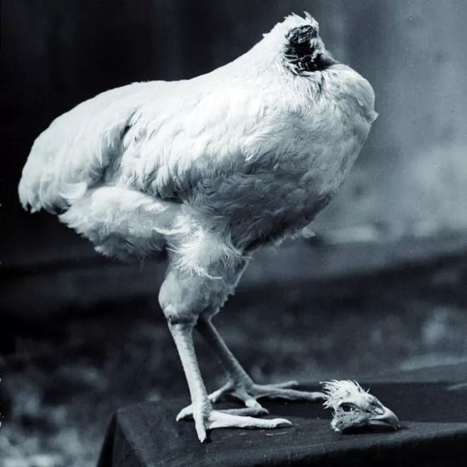 迄今为止 ,一只无头鸡存活最长的时间是18个月。20世纪40年代,在美国,一位农夫打算把养了5个月大的名叫麦克的公鸡杀了宴请岳母,没想到在砍了头之后,麦克仍旧活蹦乱跳的,它也因此摆脱了成为盘中餐的命运。麦克的主人用滴眼液瓶子给它喂食,18个月后,麦克死于黏液堵塞。