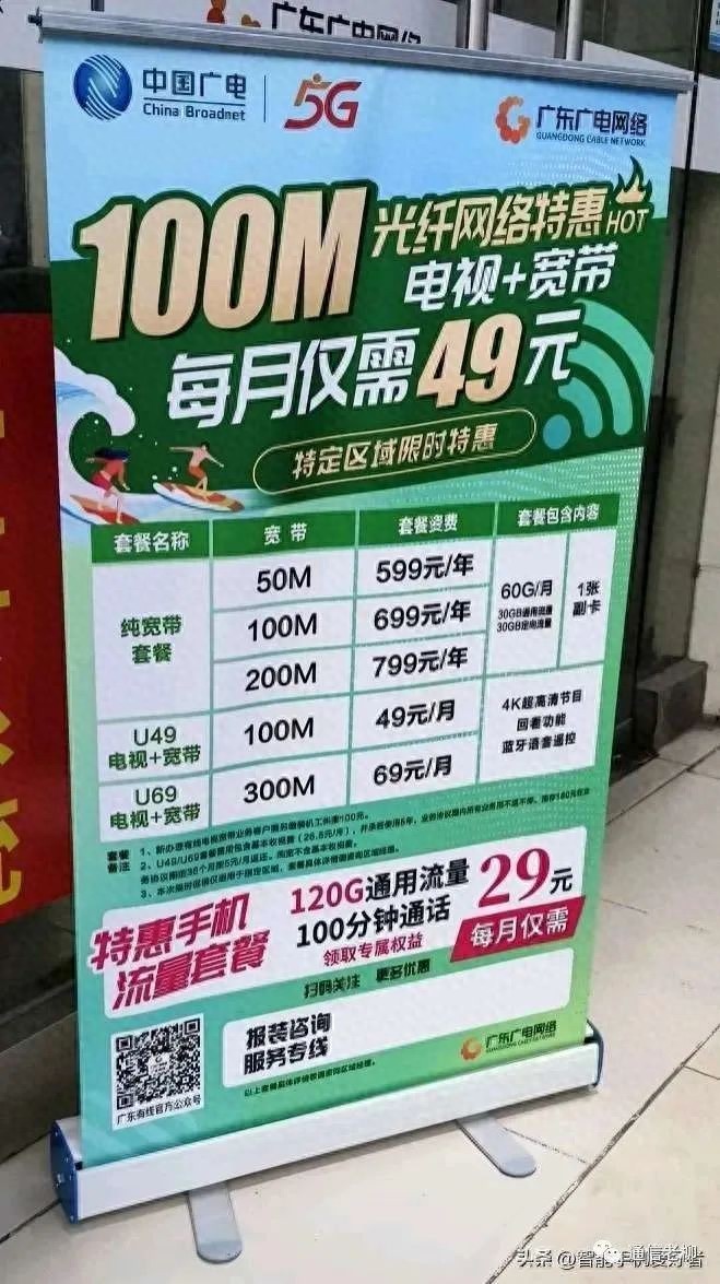 网上看到一个中国广电的宣传展架,里面的资费包括宽带和5G,其中单宽带是100M包年699元,宽带+电视包月是49元,5G手机卡是29元包120G流量+100分钟通话。