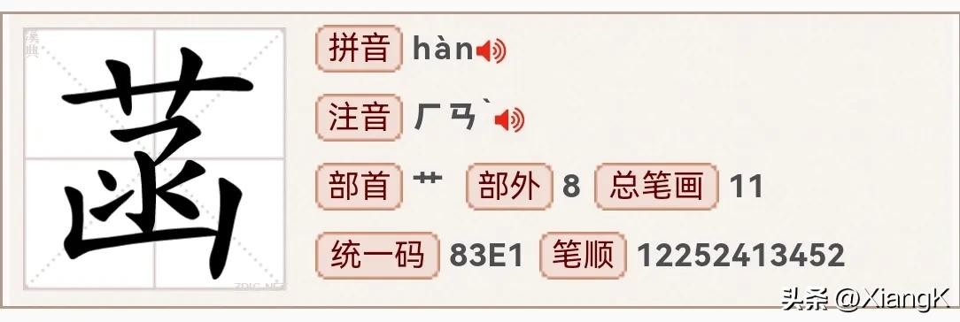 读音为“hàn”,同音字“翰&悍”,部首为“艹”,总笔画11,上下结构。