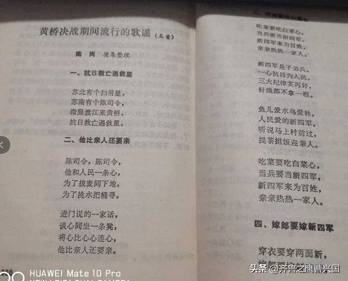 同样黄桥战役期间流传民间歌谣,歌颂陈毅司令员及新四军的《抗日救亡遇救星》《他比亲人还要亲》《吃菜要吃白菜心》《嫁郎要嫁新四军》《红缨枪 六尺长》