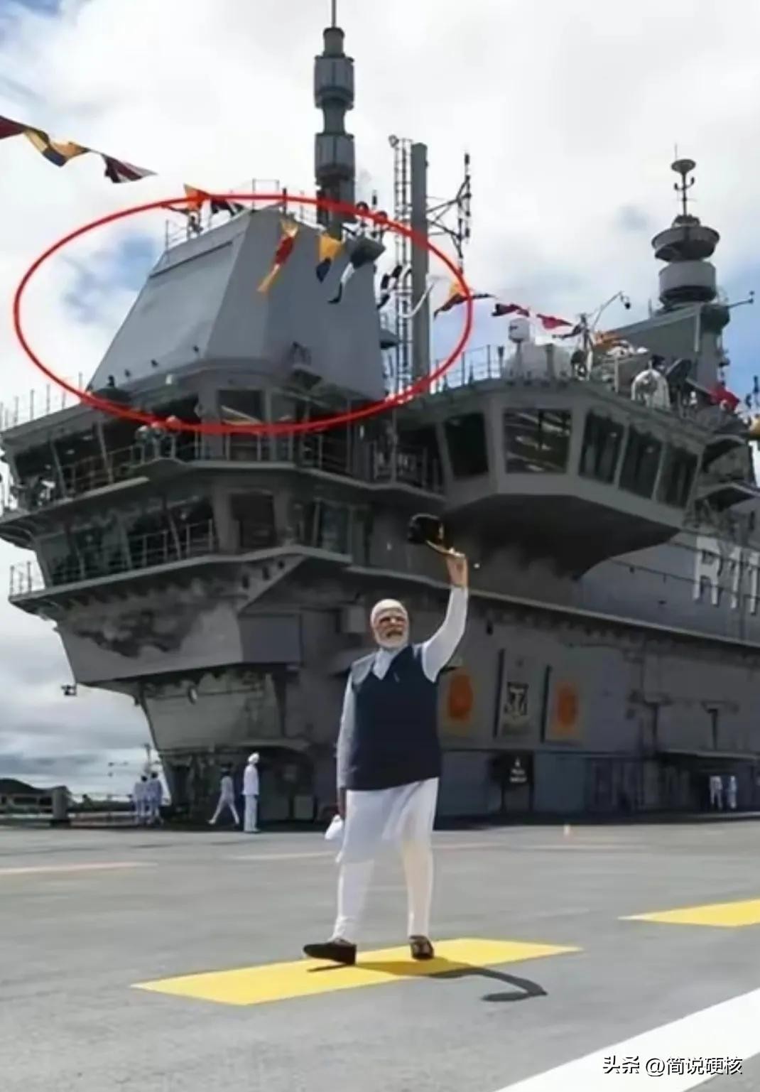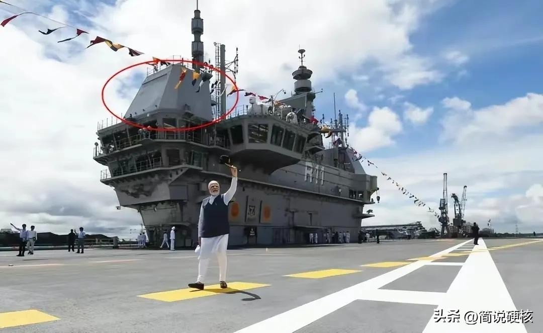 航母有个组装模块叫做舰岛,这个位置主要是装航母的眼睛——雷达。但印度的这艘航母的舰岛却是个“秃头”,雷达基座上除了海风,啥也没有。印度航母是和印度的盲人协会一起联动吗?真想问问印度总理,印度的航母为什么不装雷达,是因为不喜欢吗?