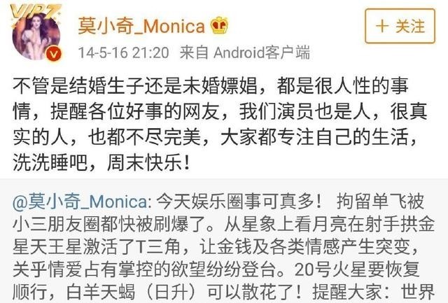 在之后传出黄海波嫖娼的消息之后,莫小棋也随之发出微博,再次声明结婚生子与嫖娼都是很人性的事情。