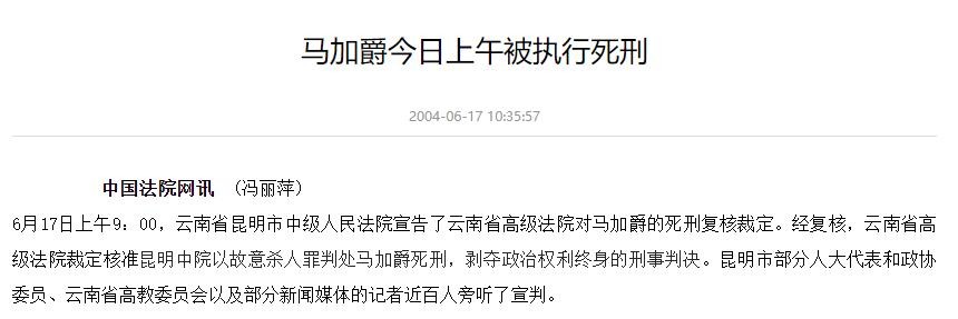 信息源:马加爵今日上午被执行死刑 中国法院网 2004-06-17