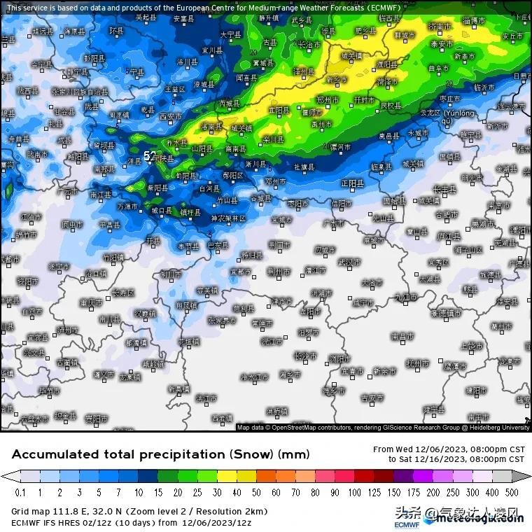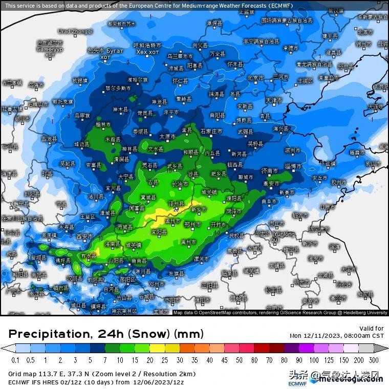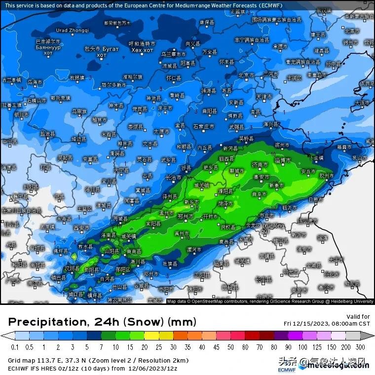 而从上午最新的预报来看,13-15号我国华北南部和黄淮大部将经历一次更强的雨雪过程,暖湿和冷空气的强度都是历史同期少见的,陕西、山西、京津冀、河南、山东7省市都将迎来大范围强降雪天气。中央气象台目前预报,山西中南部、河北中南部、山东中北部有中到大雪,河南北部有大到暴雪,陕西中南部、河南中部、山东中南部则是大范围雨夹雪或雨转雪。