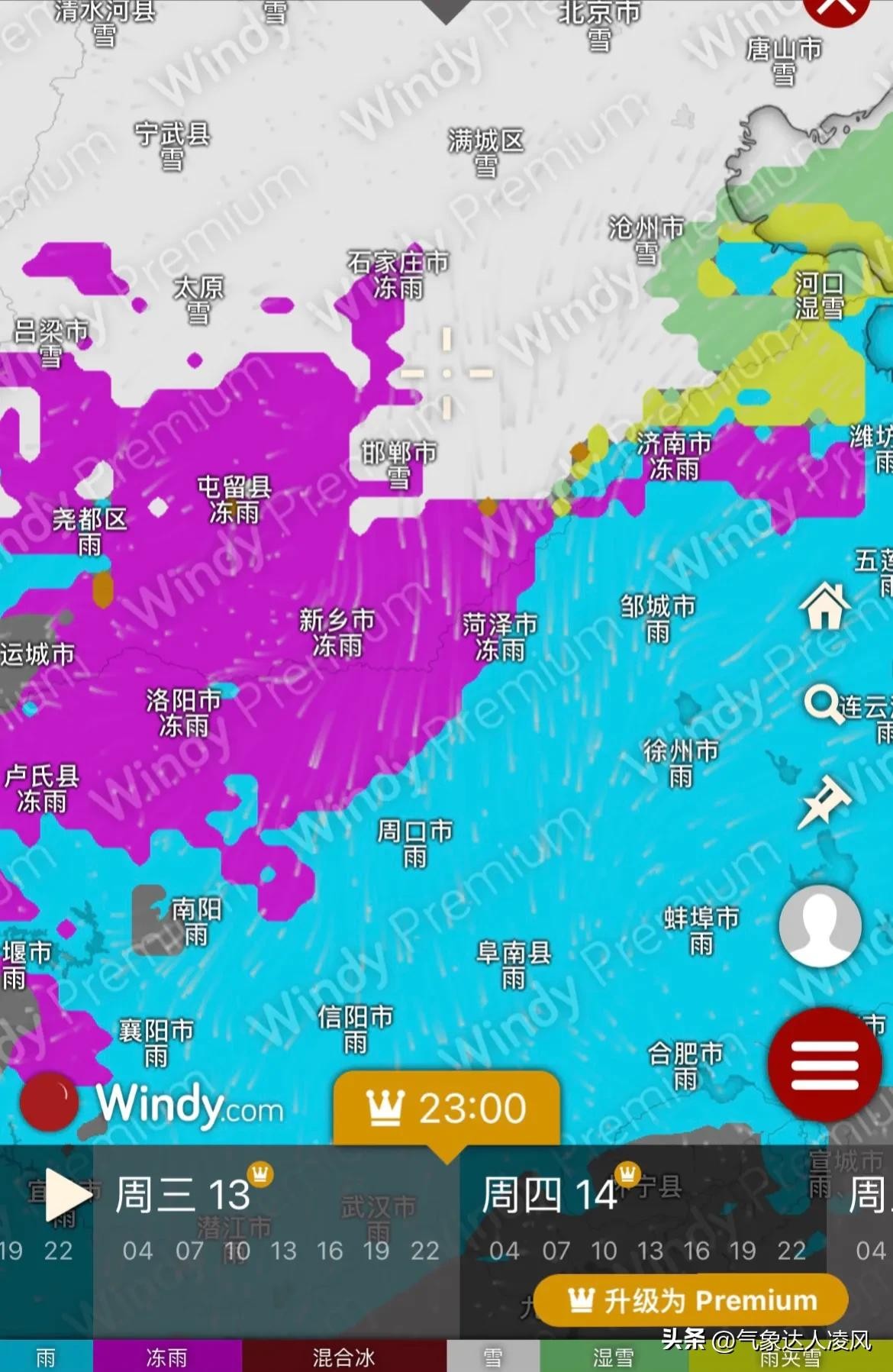 而根据数值预报,13-15号的雨雪过程暖湿气流太强了,河南山东大部的700百帕温度都高于0度,但近地面气温又降至零下。这种条件下,下雪的难度就很大了,反而更有可能出现冻雨天气。下图为数值预报给出的降水类型预报,可以看到山西南部、河南中北部、山东中部全是冻雨天气,济南、郑州都可能下冻雨而非下雪。