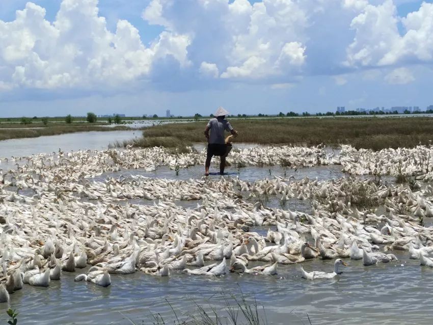 “潮落而出,潮涨而归”是这群“土著居民”的生活习性。潮落后红树林里滞留的鱼虾蟹等海洋生物,就变成了海鸭的美味大餐。晚上,回到鸭舍,它们还会进食一些稻谷和饲料,以均衡营养。