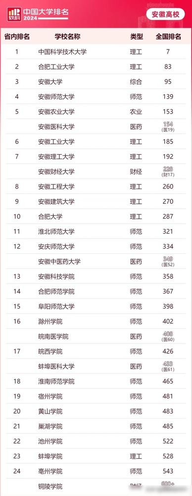 在2024软科中国大学排名中,安徽省位列前25的高校均为985和211高校,其中安理和安建大并不在前列。