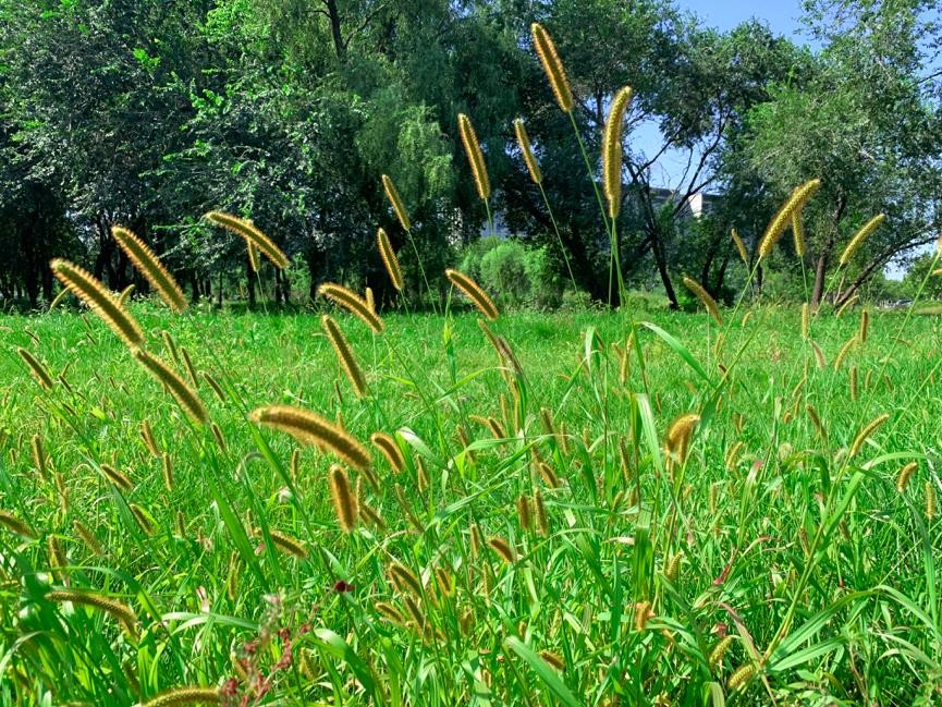 跟狗尾草很像的还有它的亲戚金狗尾草和大狗尾草。金狗尾草花穗呈现黄褐色,迎着阳光金黄色一片很是好看,而大狗尾草植株和花穗都比狗尾草大,并且花穗不像狗尾草这样顶立,而是会弯弯地垂下去。不过要说到大,那必须还得是狼尾草,狼尾草可比那几种“狗尾巴”要大上几个维度了,以至于经常有人看到后感叹,这狗尾草长的真大。狼尾草刚毛呈现金色,所以原来管它叫金色狗尾草,后来才被划到狼尾草属中。在有风的日子,一大片的狼尾草颇有风吹麦浪的感觉。