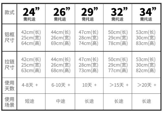 上边这几个值到底什么概念呢,我们常见的最大行李箱差不多就是32寸了,根本超不过这个三边和200厘米,即使是34寸的行李箱,那也超不过这个最大尺寸。