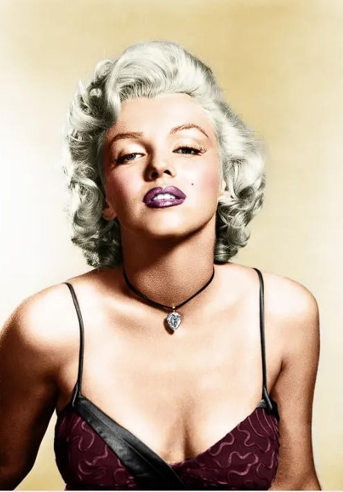我们永远无法克服她炽热的目光!在这幅 1950 年代拍摄的玛丽莲梦露肖像中,她穿着一件低垂的细肩带礼服,一条带有个性吊坠的短项链和一个有光泽的紫色噘嘴。