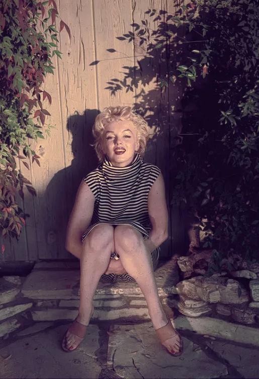 在这张 1954 年的照片中,玛丽莲·梦露穿着一件无袖黑白条纹高领连衣裙和裸色凉鞋——轻松搭配。