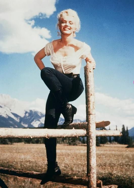 玛丽莲梦露似乎有让基本服装看起来令人兴奋的诀窍!1954年,她在拍摄《不归之河》时穿着一件露肩奶油色上衣塞进高腰黑色牛仔裤和及膝靴。