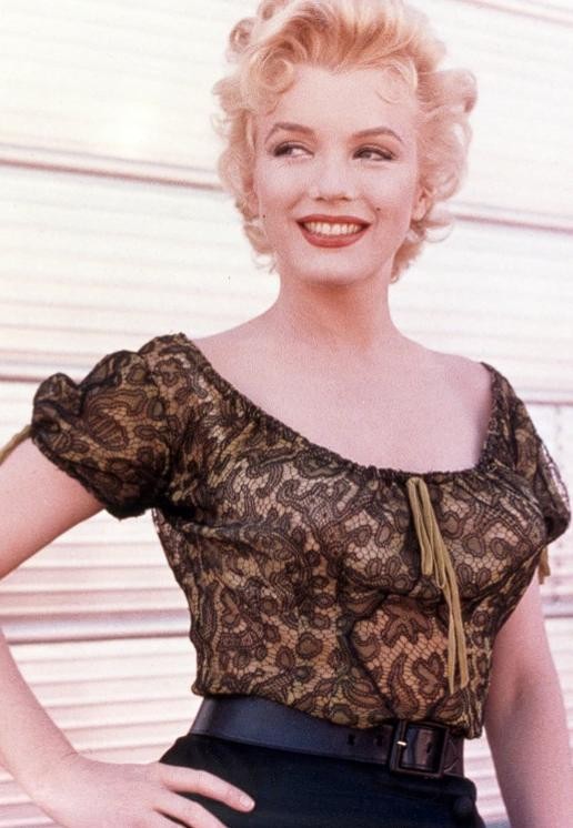 在 1956 年拍摄《巴士站》时,玛丽莲·梦露身穿一件透明蕾丝挤奶女上衣,胸前饰有蝴蝶结细节,搭配高腰黑色休闲裤和粗腰带。