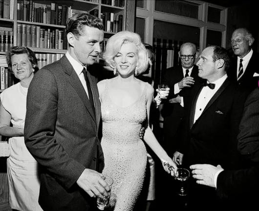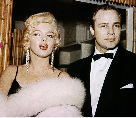 在 1955 年“玫瑰纹身”的首映式上,玛丽莲梦露——在这里看到她和她的约会对象马龙白兰度——穿着紧身黑色连衣裙和白色皮草披肩散发着好莱坞的魅力。作为配饰专家,她用一对个性吊坠耳环增添了一丝光彩。