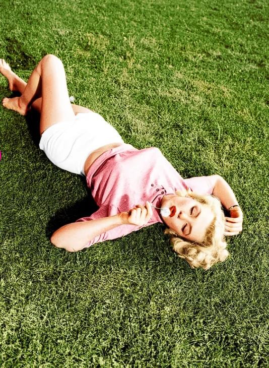 玛丽莲梦露在这幅 1950 年代的肖像中毫不费力地展示了她令人羡慕的身材。这位赤脚的好莱坞“it ”女孩穿着婴儿粉色 T 恤和高腰白色短裤,她标志性的大胆红唇将蒲公英放在嘴唇上。