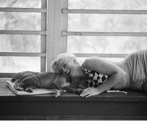 玛丽莲在家!1960 年,玛丽莲·梦露穿着简单而甜美的装束——黑白印花上衣搭配高腰裤——而她被拍到抱着一只可爱的小狗。