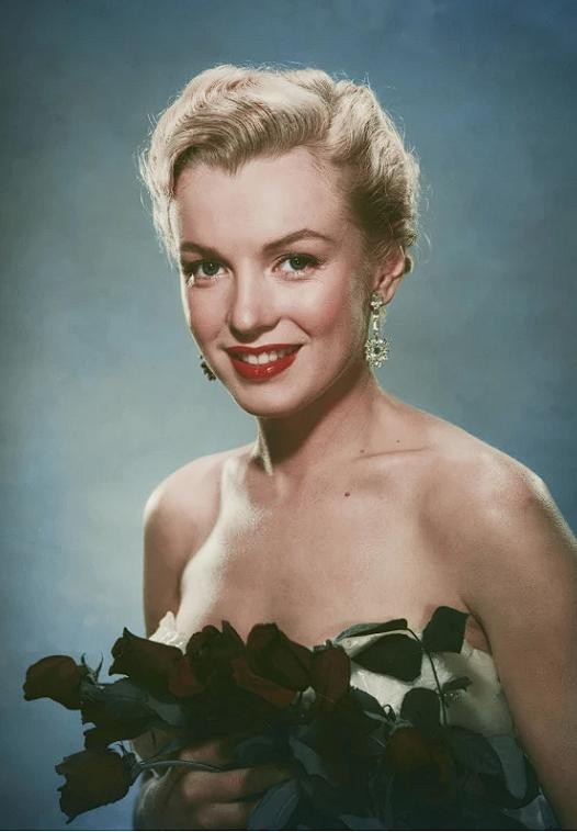 在这幅 1950 年代的肖像中,玛丽莲梦露完美的金发髻秀出她乳白色的皮肤。