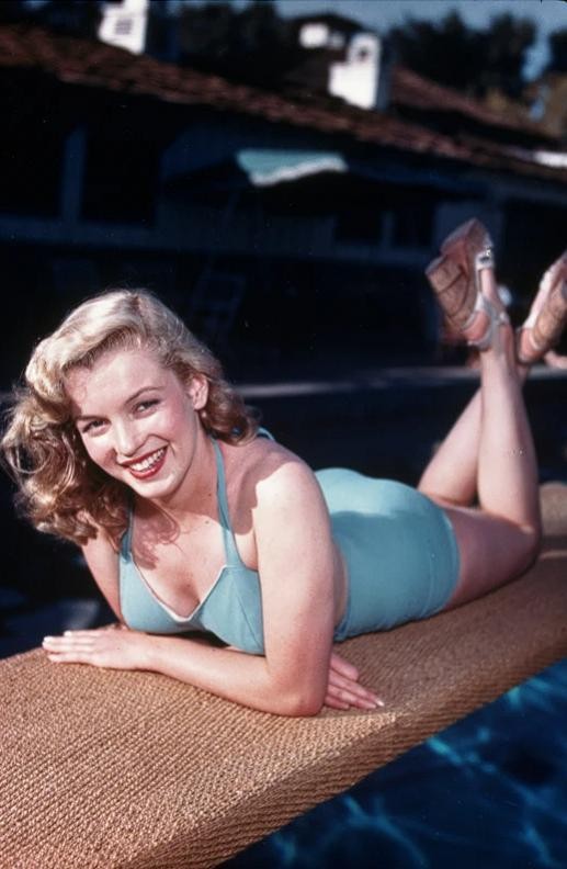 玛丽莲梦露在 1948 年拍摄这张照片时年仅 22 岁,她穿着天蓝色的两件式泳衣站在跳水板上摆姿势,是一位天生丽质的美女。