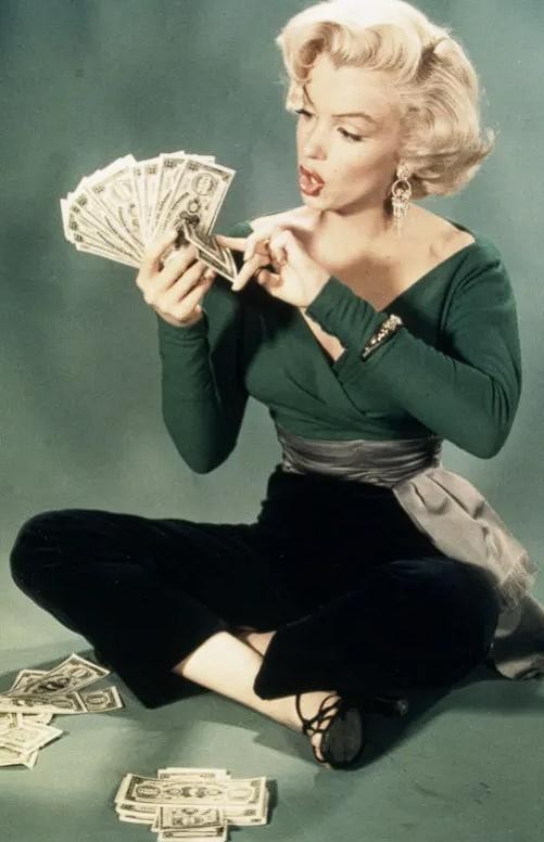 看那个图!玛丽莲梦露在 1953 年的《如何嫁给亿万富翁》中出现,身着紧身的深绿色裹身上衣,腰带采用类似货币色调的腰带收紧腰部。她穿着黑色裤子,简单的凉鞋和柔和的红唇。