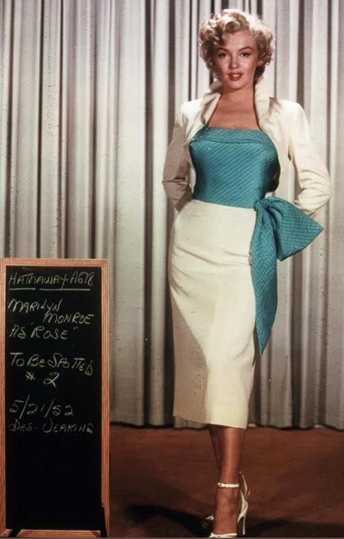 在 1953 年的“尼亚加拉”片场,玛丽莲梦露穿上了一套剪裁考究的华丽套装——蓝绿色缎面上衣搭配白色铅笔裙,搭配西装外套和绑带高跟鞋。
