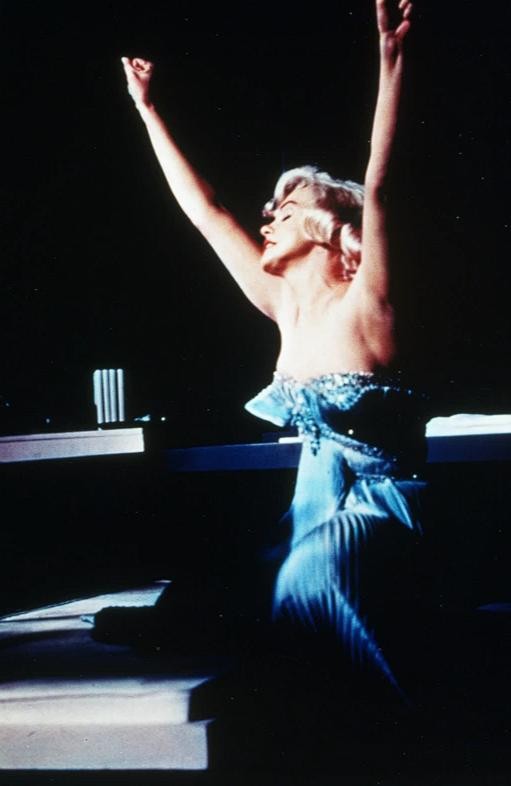 1954 年,28 岁的玛丽莲梦露在拍摄《蜜月》时在舞台上表演。为了这个场景,她穿上了一件闪闪发光的梅花色长裙和金色凉鞋。她闪亮的圈形耳环和手链为完美的画龙点睛。