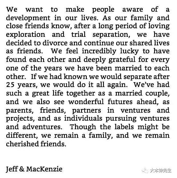 和我们熟悉的千篇一律的明星分手声明不太一样,我们能从贝索斯夫妇的声明里看出两人确实是有感情的。毕竟两人相识于“微时”(当然人家的微时和我们的恐怕不太一样),一同渡过了25年,并且共同抚养着四个孩子。