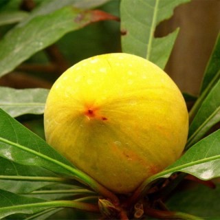 果实球形,未熟时绿色,成熟果黄绿色至橙黄色,光滑,皮薄,果肉橙黄色,富含淀粉,质地似蛋黄且有香气,含水量少,味略甜。其味道口感介乎于番薯和榴莲之间。种子通常1-2粒,近圆形或椭圆形。果实12月成熟,采收后需要后熟4-7天方可食用。