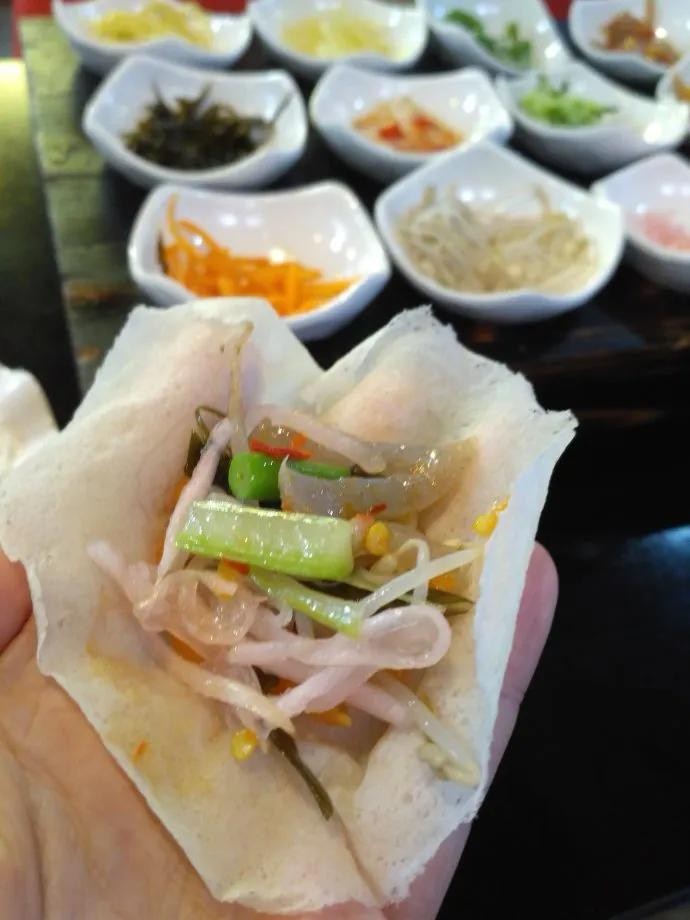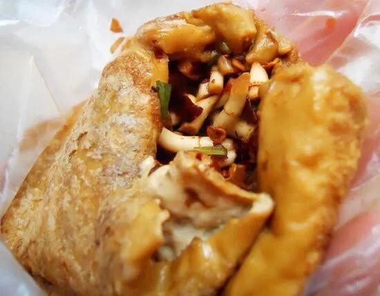 2. 丝娃娃:别名“素春卷”,用大米面粉烙成薄饼,包裹各种蔬菜丝,因外形像襁褓中的婴儿得名。搭配贵州特调自制蘸水,素菜脆嫩,面皮薄透,酸辣爽口 。