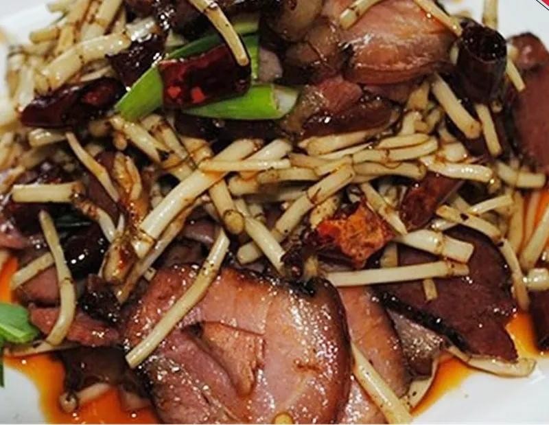 8. 腊肉炒折耳根:折耳根又名鱼腥草,是贵州常见食材,与肥瘦相间的腊肉搭配。腊肉烧皮、刮洗、煮熟切片后与折耳根炒制,辛辣清爽与咸香鲜美完美结合 。