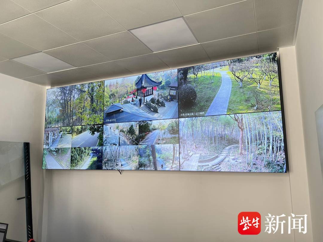 “文苑主入口的角度再调试一下,右下角监控区域的点位名称再精细一点。”控制室内,工作人员忙着校准摄像头角度,确认点位名称。记者注意到,墙上的电子屏幕上,景区内每一个出入口和路口都清晰展示在眼前,而山顶铁塔的高清摄像头则让整片山林一览无余。如此一来,治安监控和森林防火都能够得以保障。