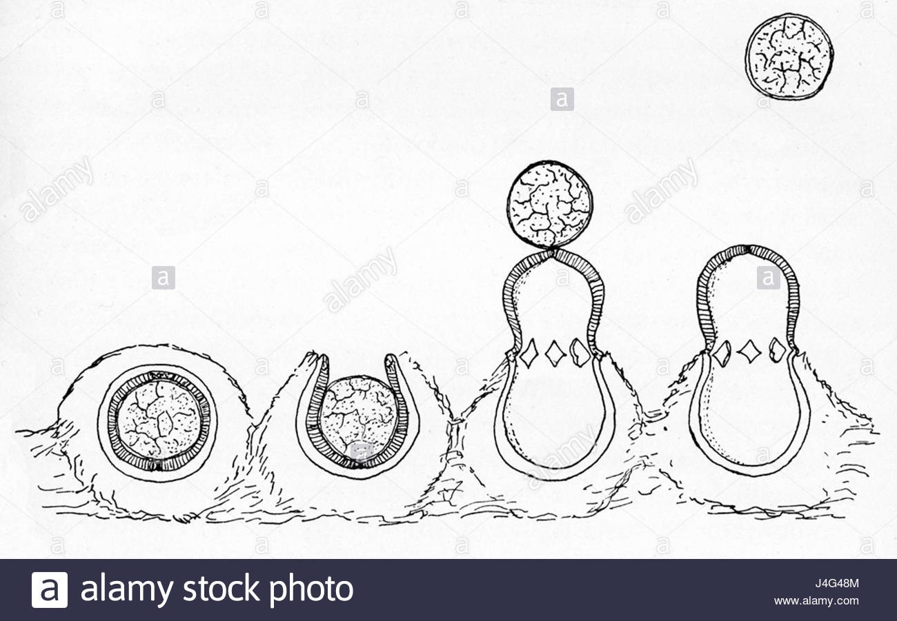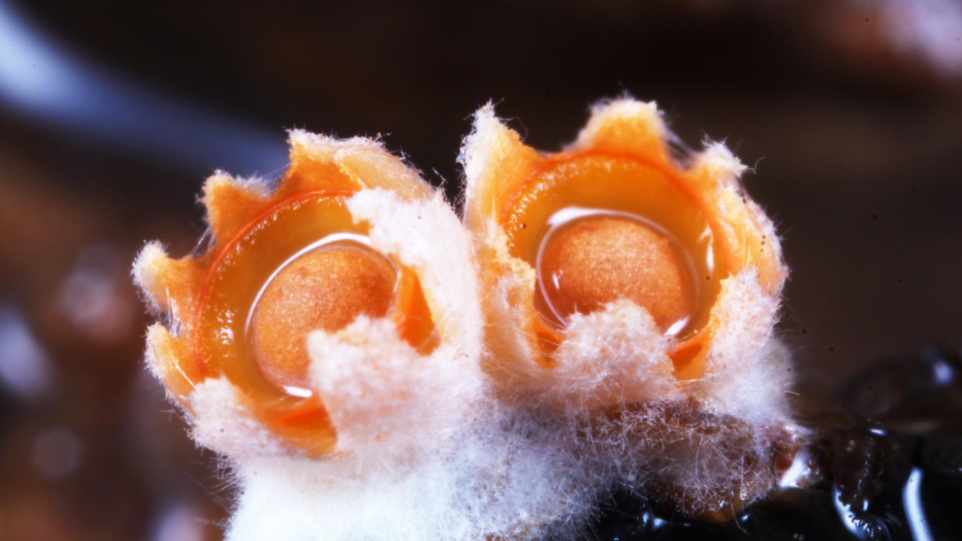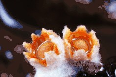 弹出孢子小包之后,吸水膨胀至球状的内包被突出来
