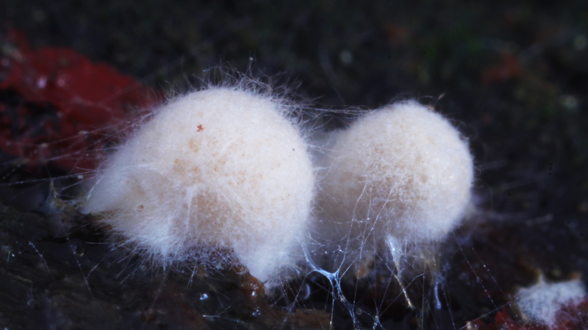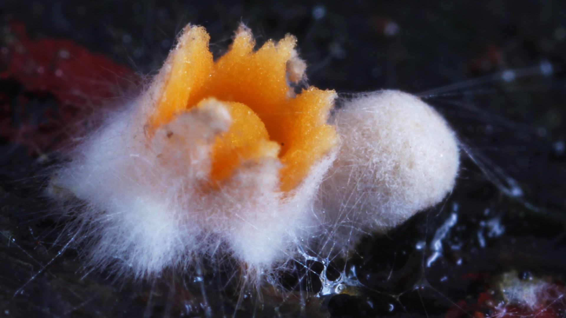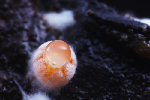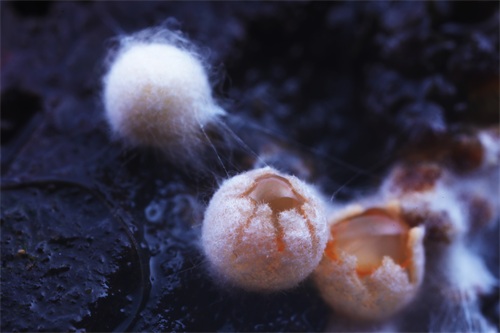↓这是发育中的弹球菌,近球形,外面是毛绒绒的外包被。