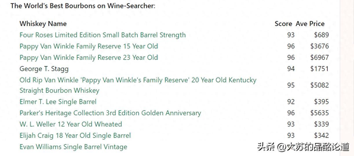 这10款波本威士忌的平均价格达到2491美元。看来,消费者想要享受这些“最佳”需要付出高昂的代价。不过,令人惊喜的是,排名第10的伊万·威廉姆斯(Evan Williams)年份单桶波本威士忌,其均价仅为41美元。