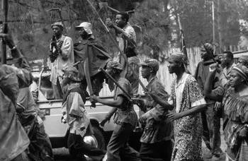 就连维和部队也要撤离。大巴车跟前各国的白人都走向车子,不知真相的本地人,一窝蜂地涌向车子,