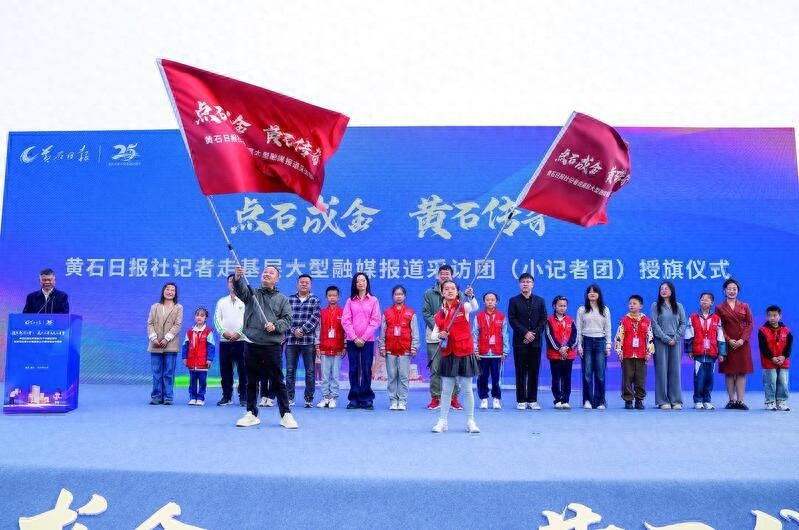 11月9日上午,在未苏湾举行的“致敬新闻力量——大小记者共庆记者节”黄石日报社庆祝第25个中国记者节暨黄石日报小记者团成立25周年粉丝节活动中,“点石成金 黄石传奇”黄石日报社记者走基层大型融媒报道正式启动。市委宣传部副部长丁元拾,黄石日报社党委书记、社长皮正茂为采访团授旗,黄石日报全媒体采集中心总监、社会新闻部主任石教灯,黄石日报小记者团小记者代表、团城山小学505班同学吴祎然上台接旗。
