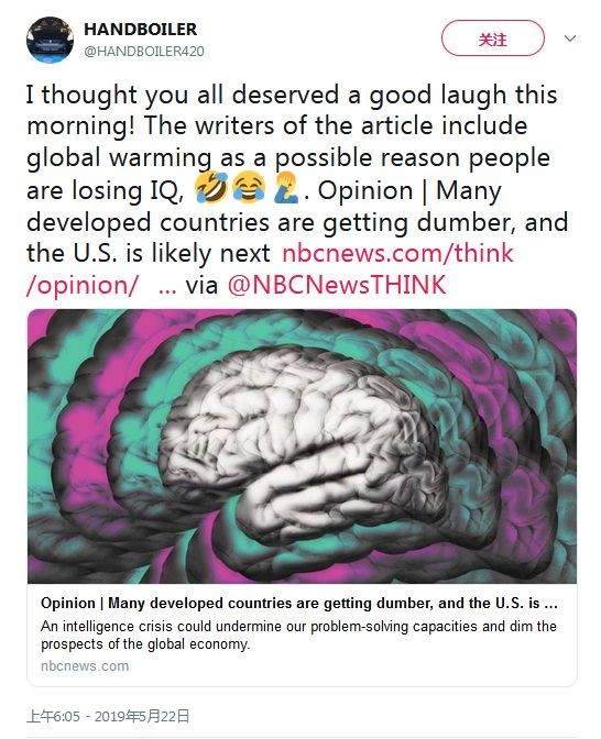 我觉得今天早上的这条新闻真好笑。这篇文章的作者把全球气候变暖也包括在人类智商下降的原因中。