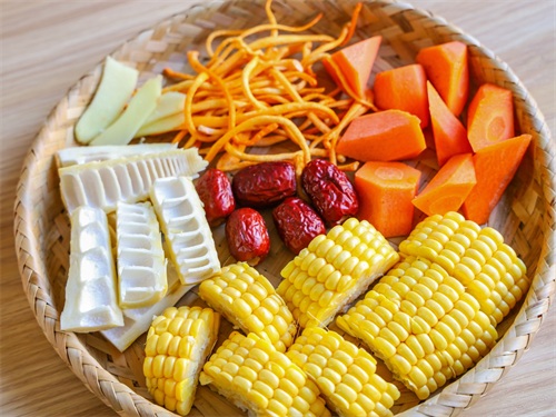 1.准备虫草菇、红枣、胡萝卜、玉米段、焯水的春笋、姜片