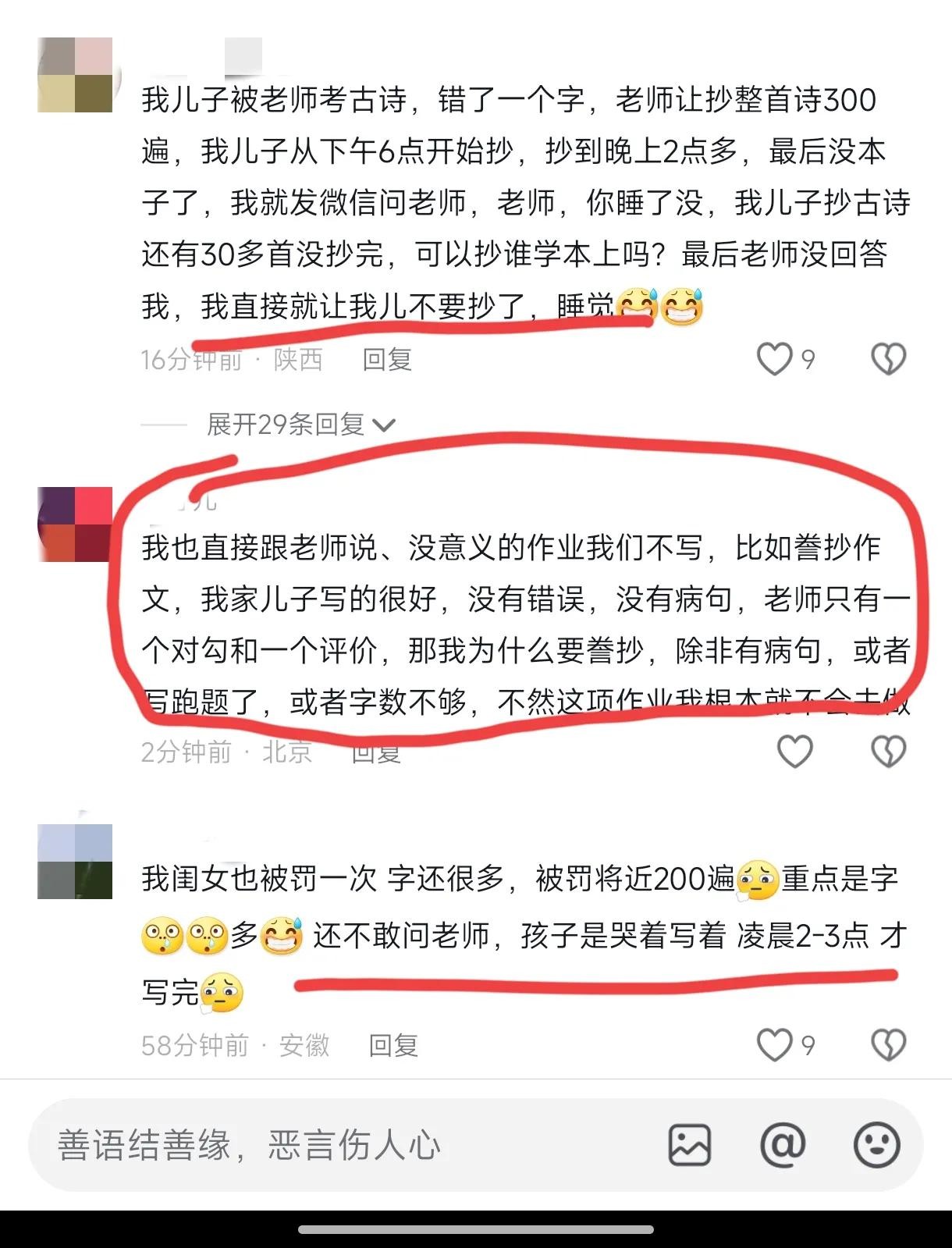 很多家长说自己的孩子都有过类似经历,一些普通的家长就可能陪着孩子默默承受抄写到深夜,还有一些勇敢的家长认为孩子太小不能应该承受这么大压力,所以直接拒绝老师的罚抄,让孩子充分休息。