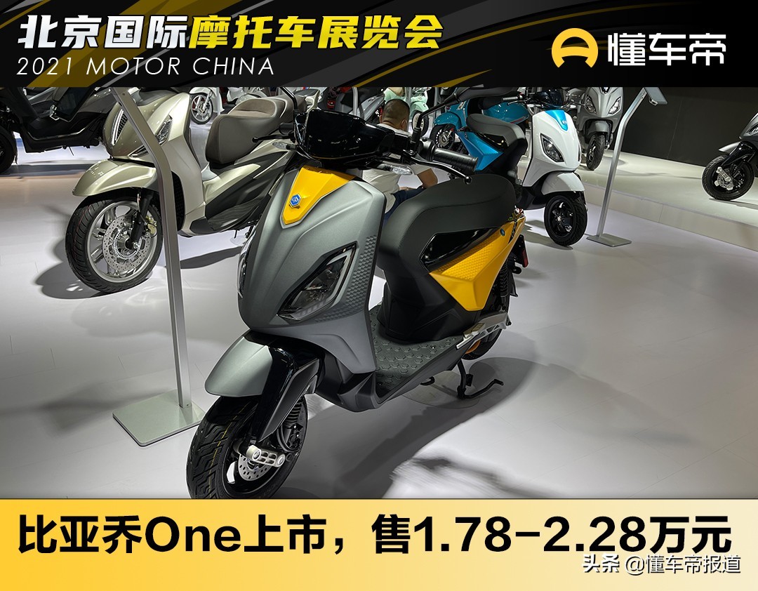 [懂车帝原创 产品] 5月28日,2021北京国际摩托车展拉开帷幕,在现场懂车帝获悉,比亚乔最新的纯电动摩托车Piaggio One已经正式上市,轻便摩托1.78万起,摩托车版本2.28万元,这也是比亚乔的第一台电动摩托车。