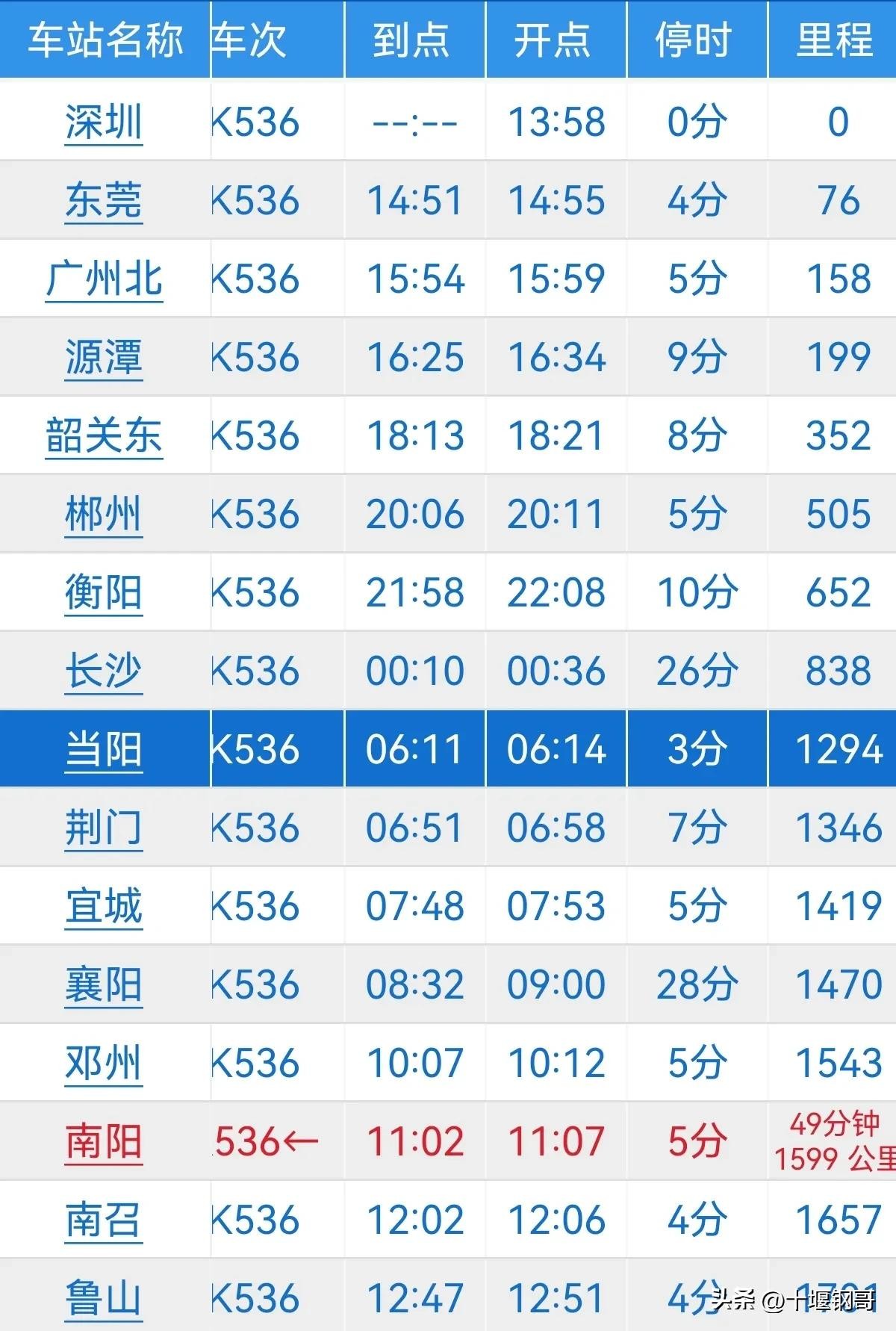 k536次深圳到洛阳普速火车全程1855公里,运行25小时54分钟,沿途主要停靠东莞,广州北,源潭,韶关东,郴州,衡阳,长沙,当阳,荆门,宜城,襄阳,邓州,南阳,南召,鲁山,宝丰,汝州,洛阳。
