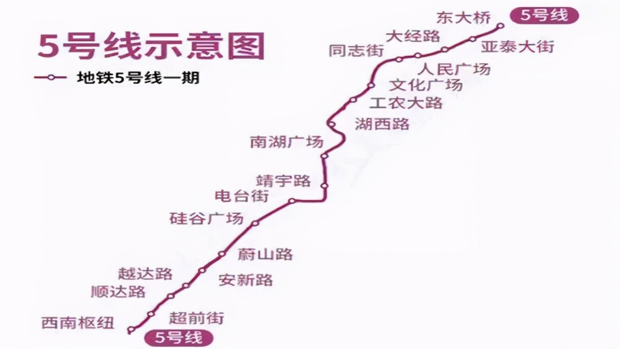 长春地铁5号线又叫做城市轨道5号线,整个线路起始于西南枢纽站,终止于东大桥站,贯穿朝阳区、南关区,沿途经过多个地点,比如:南湖广场、南湖公园、红旗街万达广场、欧亚商都、人民广场等地,这些地方都是当地有名的建筑,不仅拥有超多的人流量,而且也是民众经常会去的休闲娱乐场所。