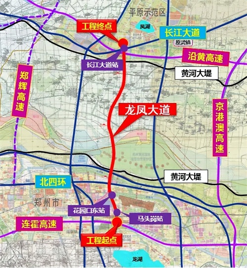 2022年1月24日,河南省政府采购网发布龙凤大道招标公告,郑新高速(龙凤大道)作为《河南省高速公路网规划(2021-2035年)》中新增的4条郑州都市圈辐射路线之一,是连接郑州市龙湖和新乡市平原示范区凤湖的重要通道,建成后进一步落实新乡“南向发展"战略,推动郑新一体化,打造郑新同城化、无感化。龙凤大道南起郑州市连霍高速,向北敷设依次上跨北四环快速路、黄河及沿黄高速,北至平原示范区的长江大道,接太行大道,全长约17.3公里,全线为双向六车道规模,设计速度为100公里/小时,匡算总投资95亿元,其中郑州境7.5公里,新乡境10.5公里。
