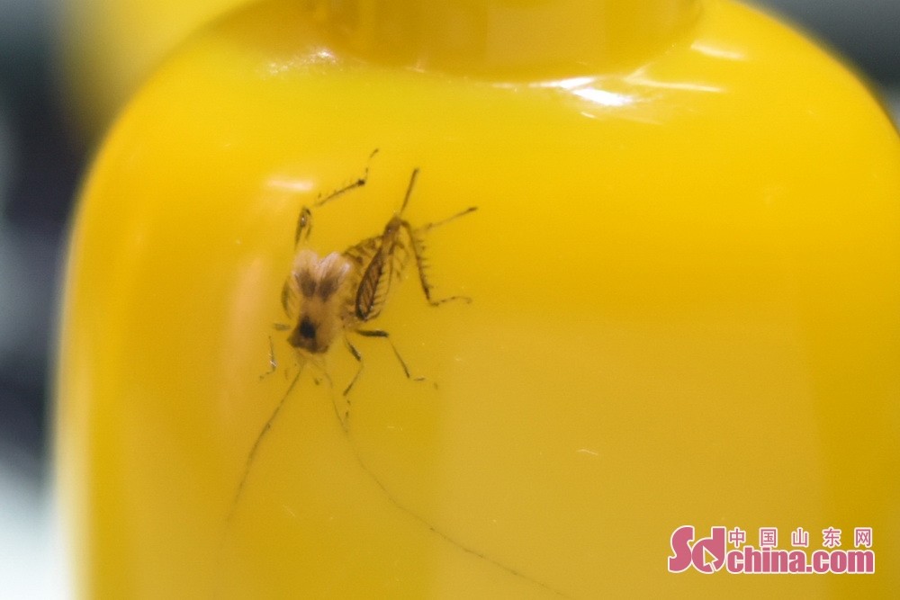 鸡油黄鼻烟壶《雅集》。山东省工艺美术大师、康乾琉璃博物馆副馆长徐峰告诉记者,鸡油黄的制作配方非常复杂,要精心调配,特别在烧制过程中更为讲究。品质上乘的鸡油典作品极少,匠人中有十缸九不成之说。因此,此种料器更显得珍贵。